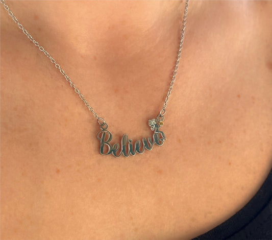 „Hör niemals auf zu träumen, nur wer träumt, kann fliegen“ „Believe“-Halskette mit der kleinen Tinker...